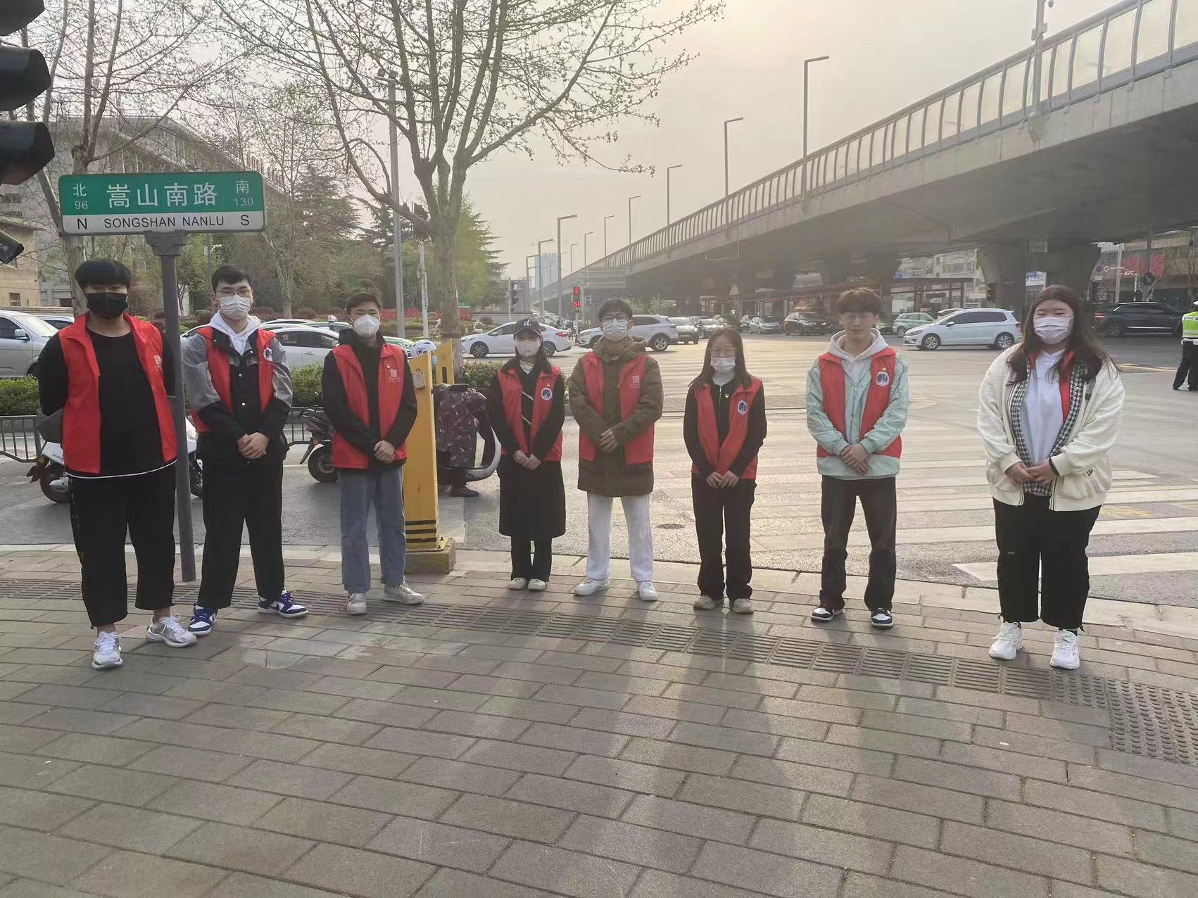 组织学生党员志愿者在中原区嵩山路与陇海路口开展“文明交通,平安出行”志愿服务。