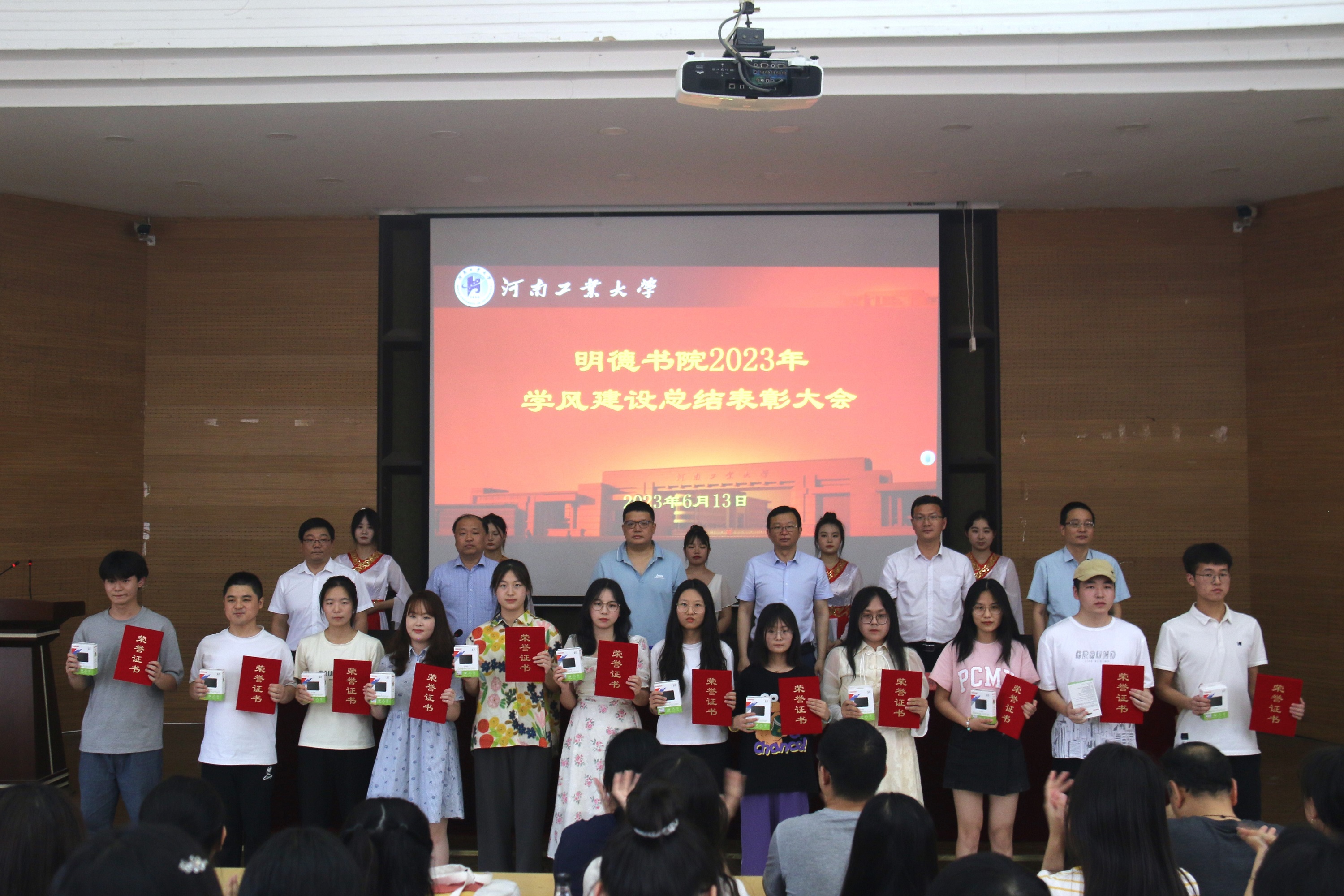 关于表彰2023年学风建设先进个人和先进集体的决定》,与会领导向受表彰的集体和个人颁发荣誉证书和奖品,并合影留念。