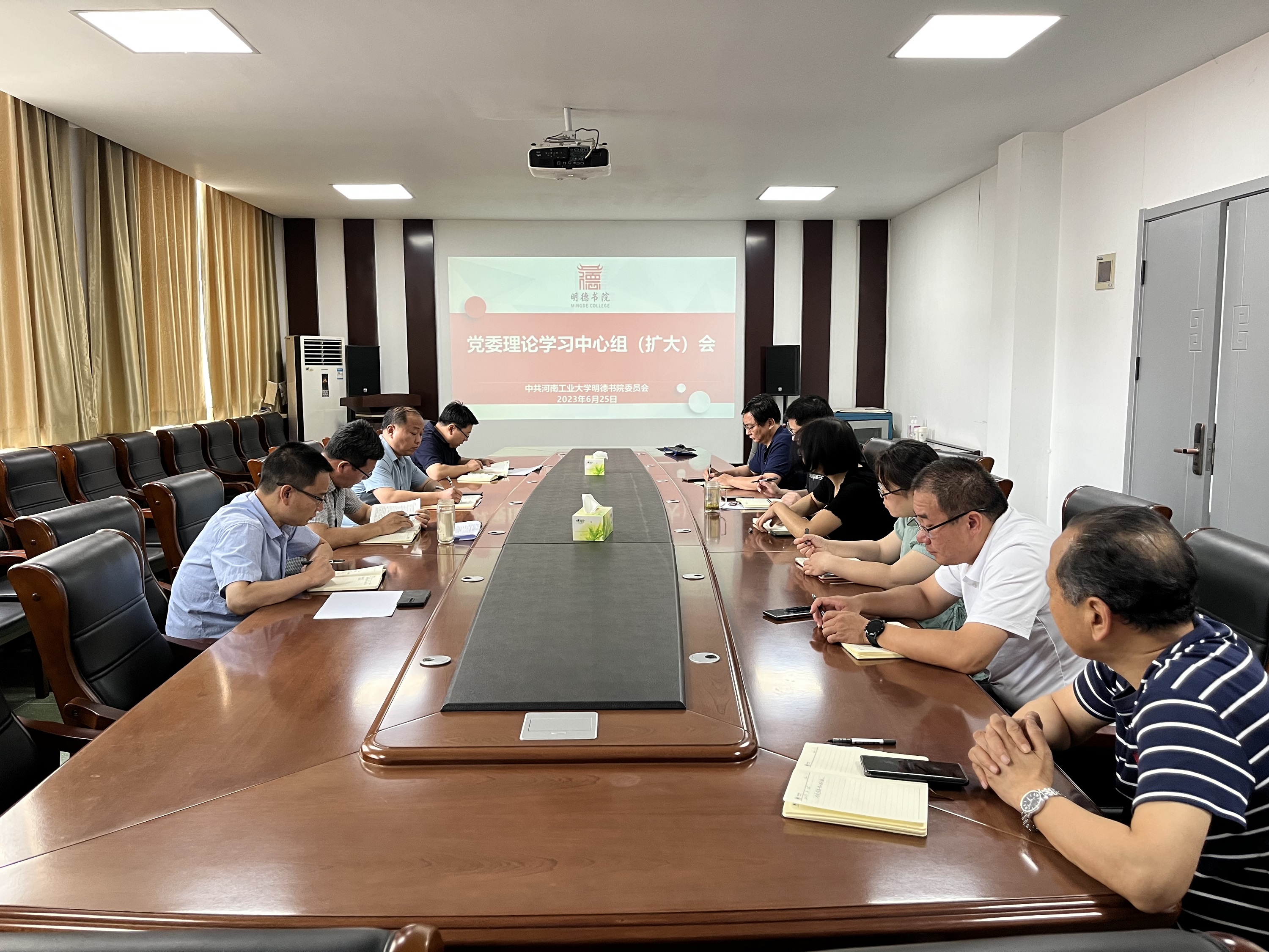 党委理论学习中心组在会议室207召开中心组(扩大)会议。书院领导班子及各科室科长参加了本次学习。会议由院党委书记魏朝举主持。