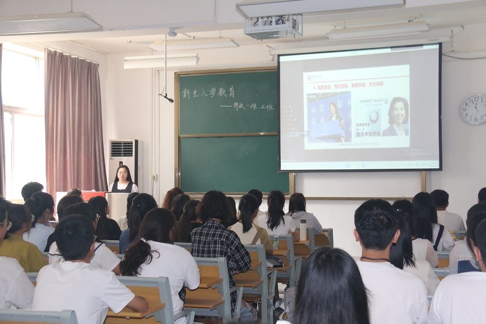 学工办主任王荣健教育引导新生坚定报国志向,鼓励适龄青年踊跃参军,力争成为有灵魂、有本事、有血性、有品德的青年学生。谷保材老师向新生介绍了我校学生资助体系的构成,详细讲解了各类资助项目的申请及办理流程。
