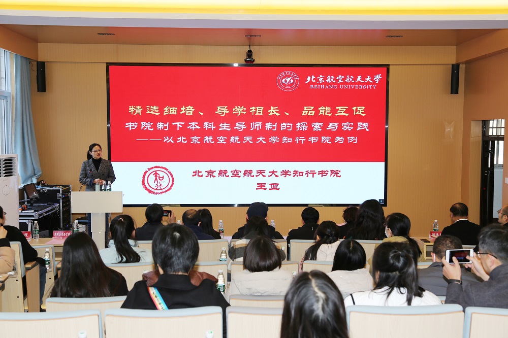 会议分为两个阶段,在第一阶段学业导师培训中,北京航空航天大学知行书院执行院长王亚,做了题为“精选细培、导学相长、品能互促,书院制下本科生导师制的探索与实践”的主题交流。她主要从知行书院简介、本科生导师制的起源与发展、知行书院导师制的建设历程及制度、运行模式、工作成效评价、工作典型案例和工作阶段成果等七个方面导师制具体实施进行了培训指导。她认为导师制是书院制育人模式的重要载体,希望学业导师能通过对学生进行思想引领、学业指导、学术引导、生活关怀和生涯规划等,成为学生成长道路上的“引路人”。