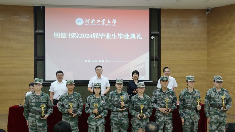 李震介绍了书院2024届专科毕业生基本情况,刘飞翔宣读了《关于表彰2024年优秀毕业生的决定》,出席典礼的领导为受表彰的优秀毕业生颁发了荣誉证书。同时,书院还向退役大学生士兵代表赠送了纪念品,以表达对他们参军入伍献身国防的敬意和感谢。