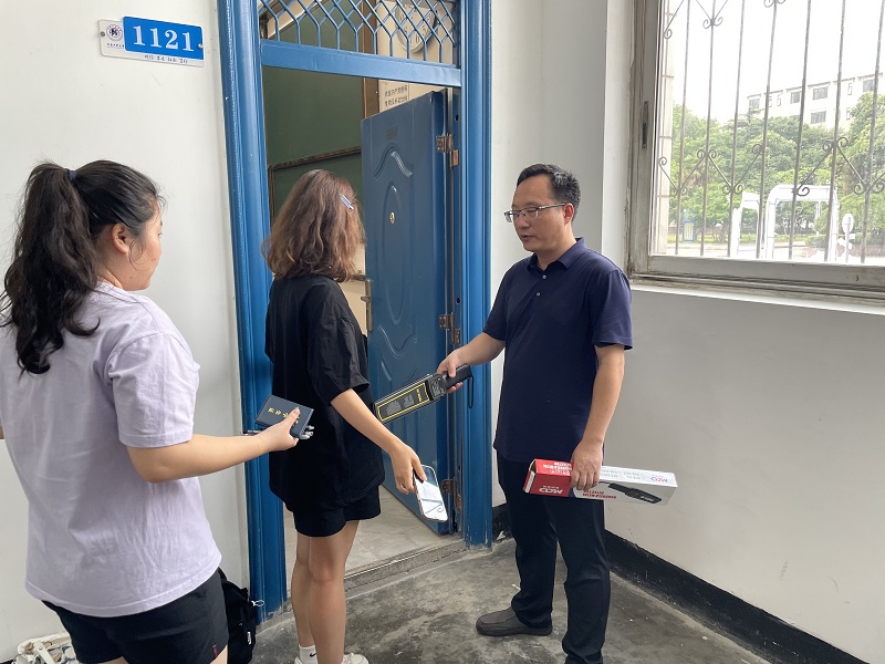 监考教师使用金属探测器进行入场检查