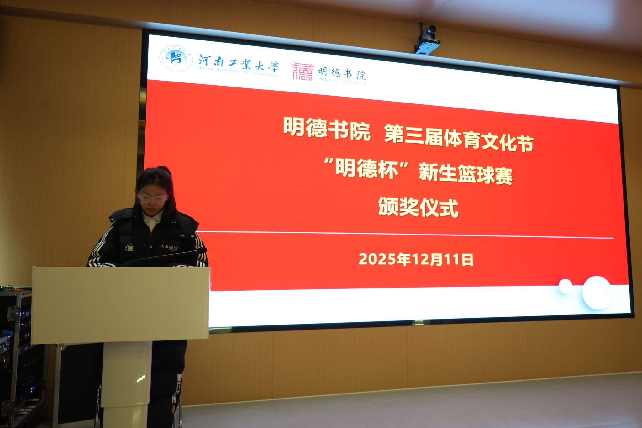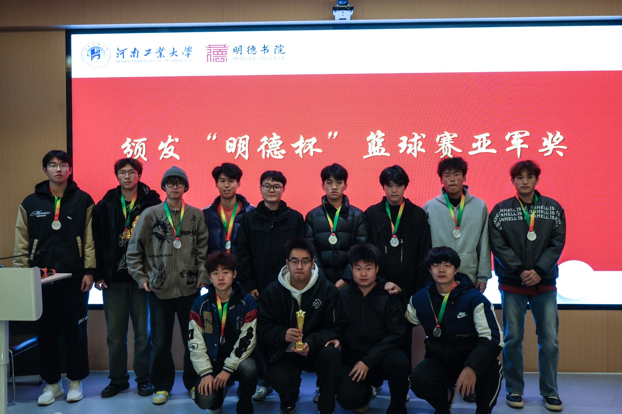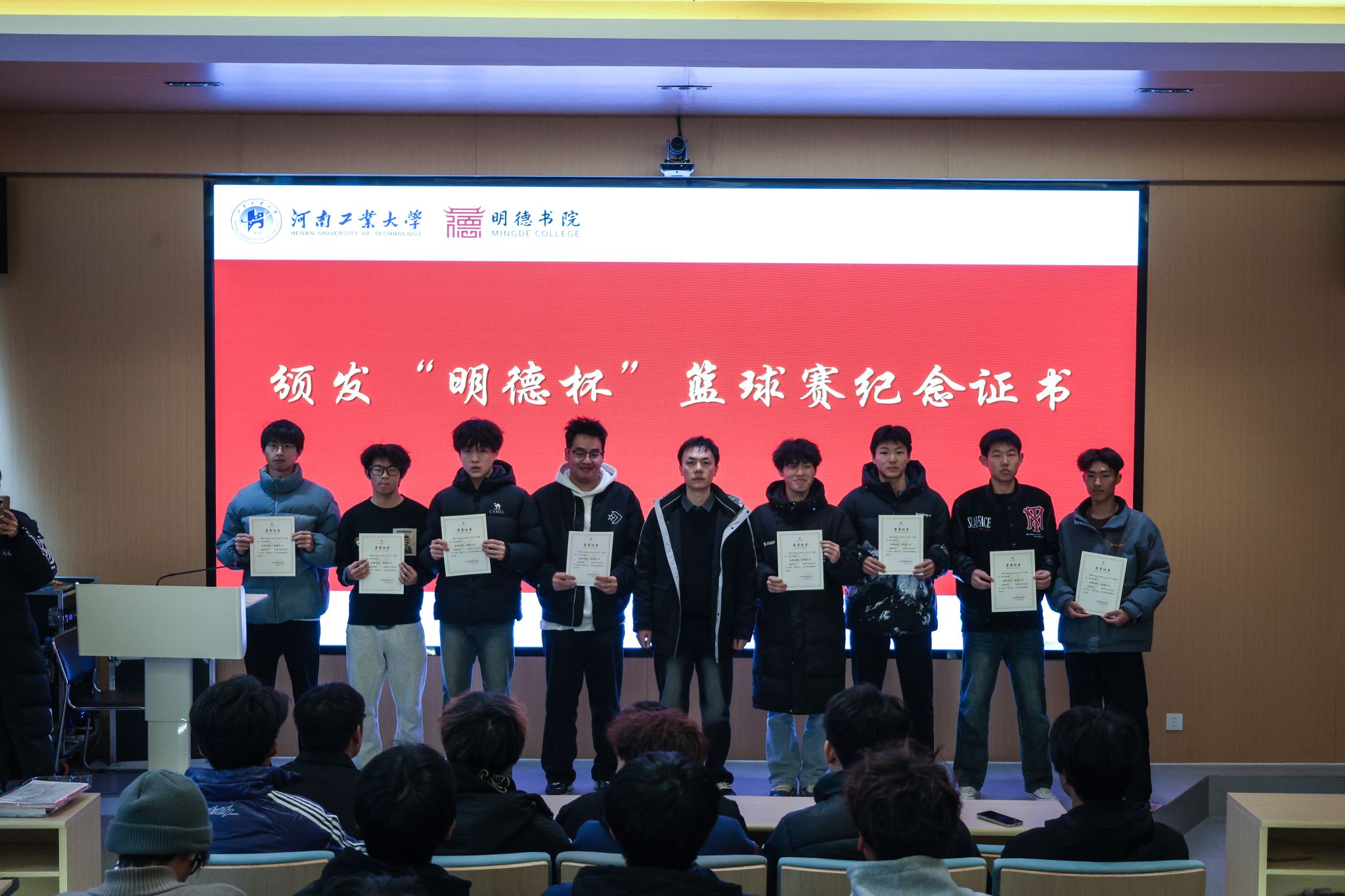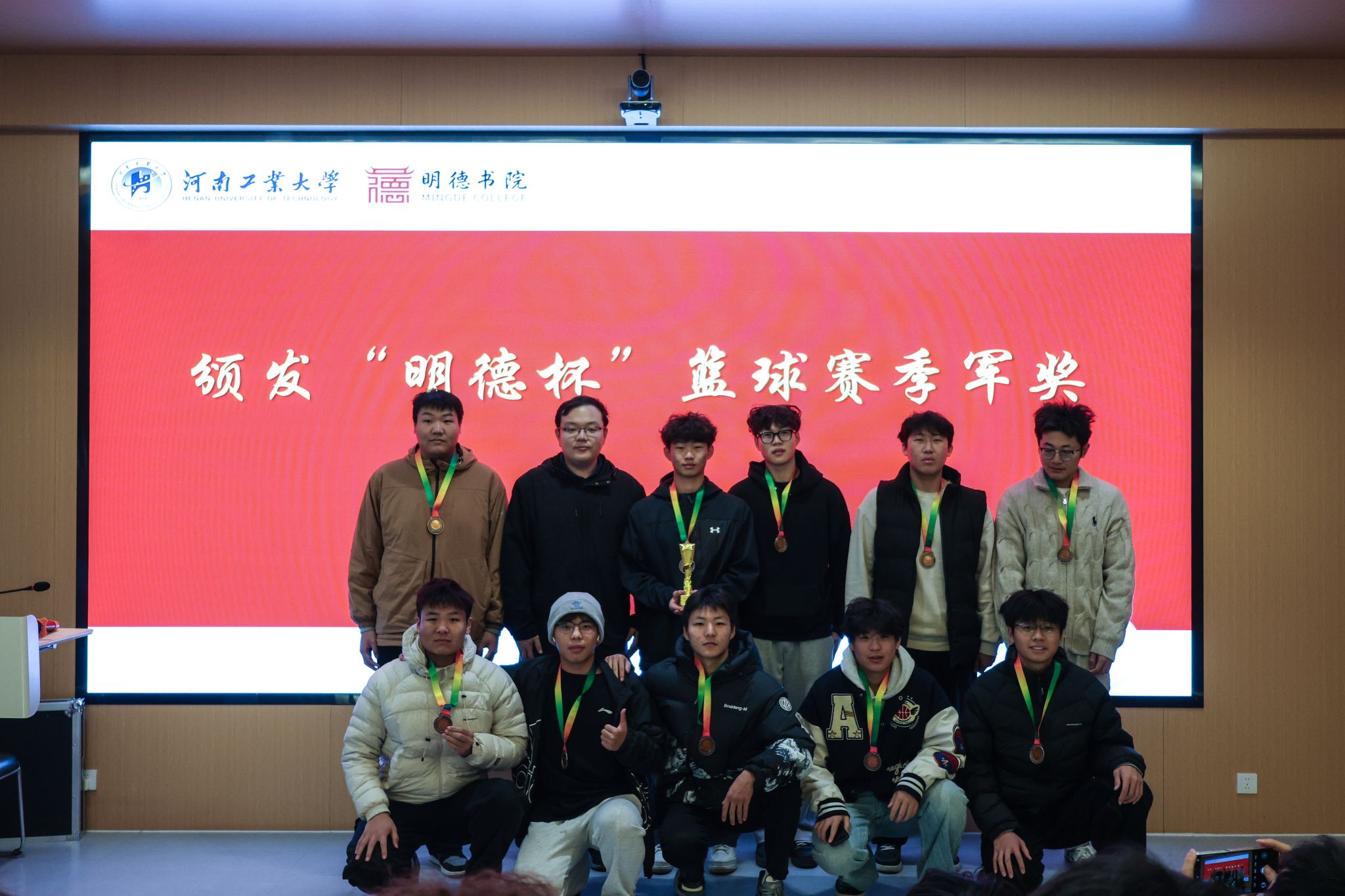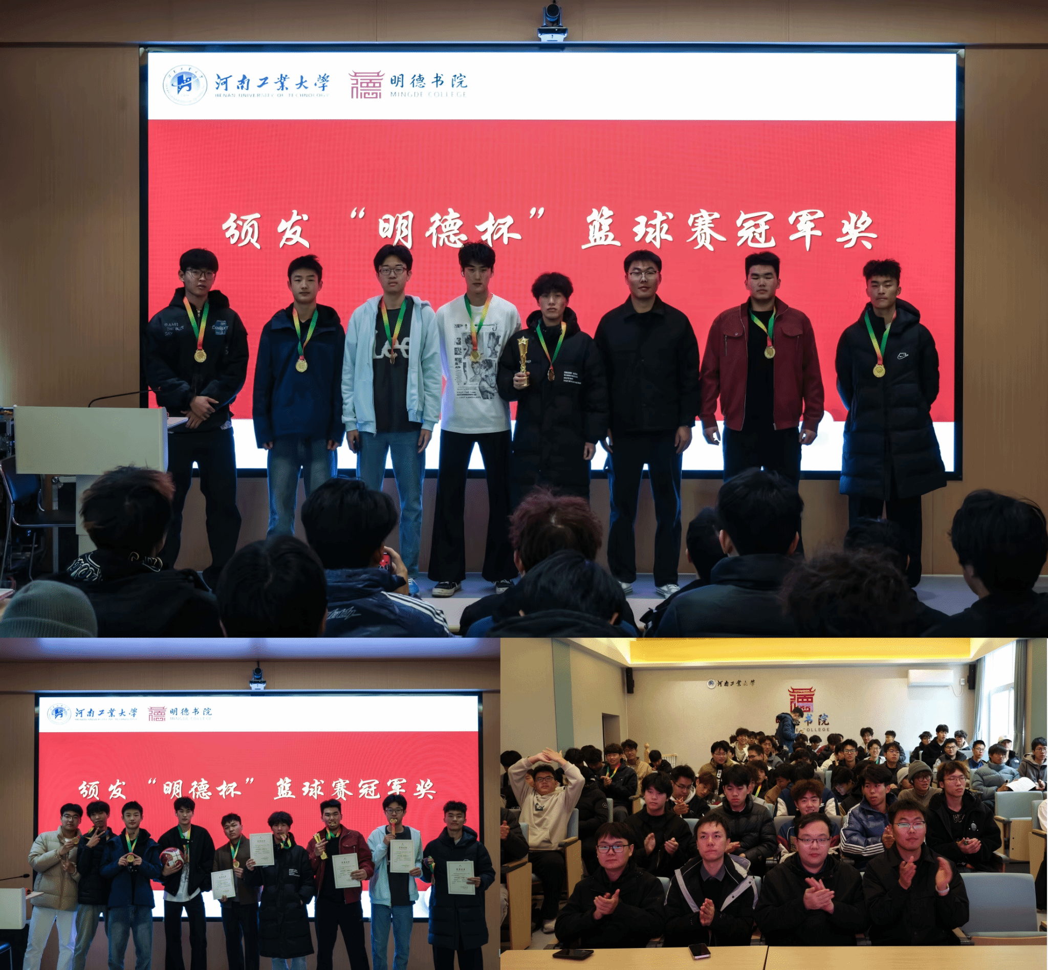 颁奖环节中,主持人分享了赛事中的成长瞬间,重温“体育育人、全面发展”的活动宗旨。李峥老师为各队颁发参赛纪念证书,雷超凡、李国根、杨广辉老师分别为季军、亚军、冠军队伍颁奖。老师们在致辞中充分肯定了同学们的表现,并鼓励大家将篮球赛场上的团结协作、奋力拼搏精神延续到日常学习与生活中。