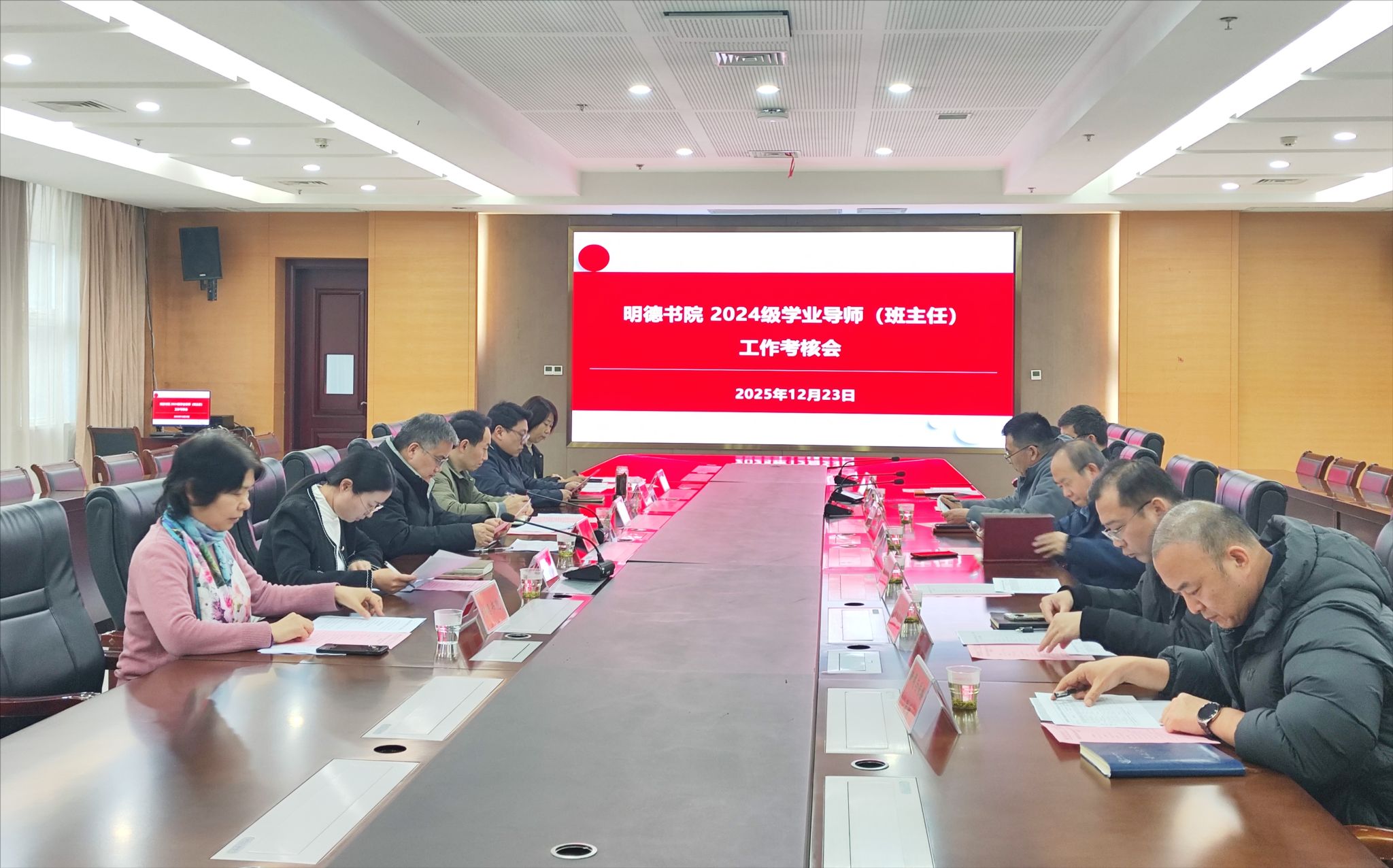 考核组工作人员王丽波详细汇报了2024级学业导师(班主任)考核的整体情况。通过个人总结、书院核查、学生评价等多环节综合评定,全面梳理了2024级学业导师(班主任)自任职以来的工作开展情况。考核结果显示,绝大多数学业导师(班主任)都能够认真履行岗位职责,紧密围绕学生成长需求,开展学业规划指导、学风建设引领、心理健康关怀等工作,有效助力新生适应大学学习生活。
