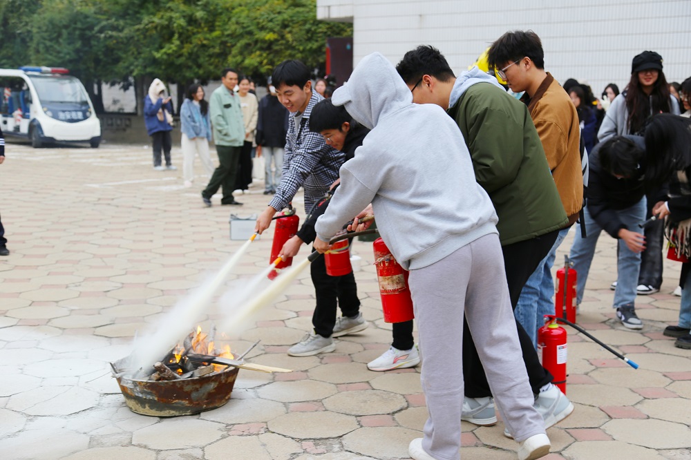 随后,由消防救援大队指战员们组织参会人员在喷泉广场开展了消防实操演练。消防员同志现场讲解了干粉灭火器、二氧化碳灭火器、水基型灭火器的区别和使用方法,重点强调了消防标识识别方法、消防通道疏散要点、火灾疏散的动作要领和注意事项等内容,并分别进行了现场演示,“手把手”指导学生进行灭火器实操演练,学生们积极参与,轮流上阵,亲身体验,学习掌握灭火器“一提、二拔、三握、四压”等使用技能,现场气氛十分活跃。