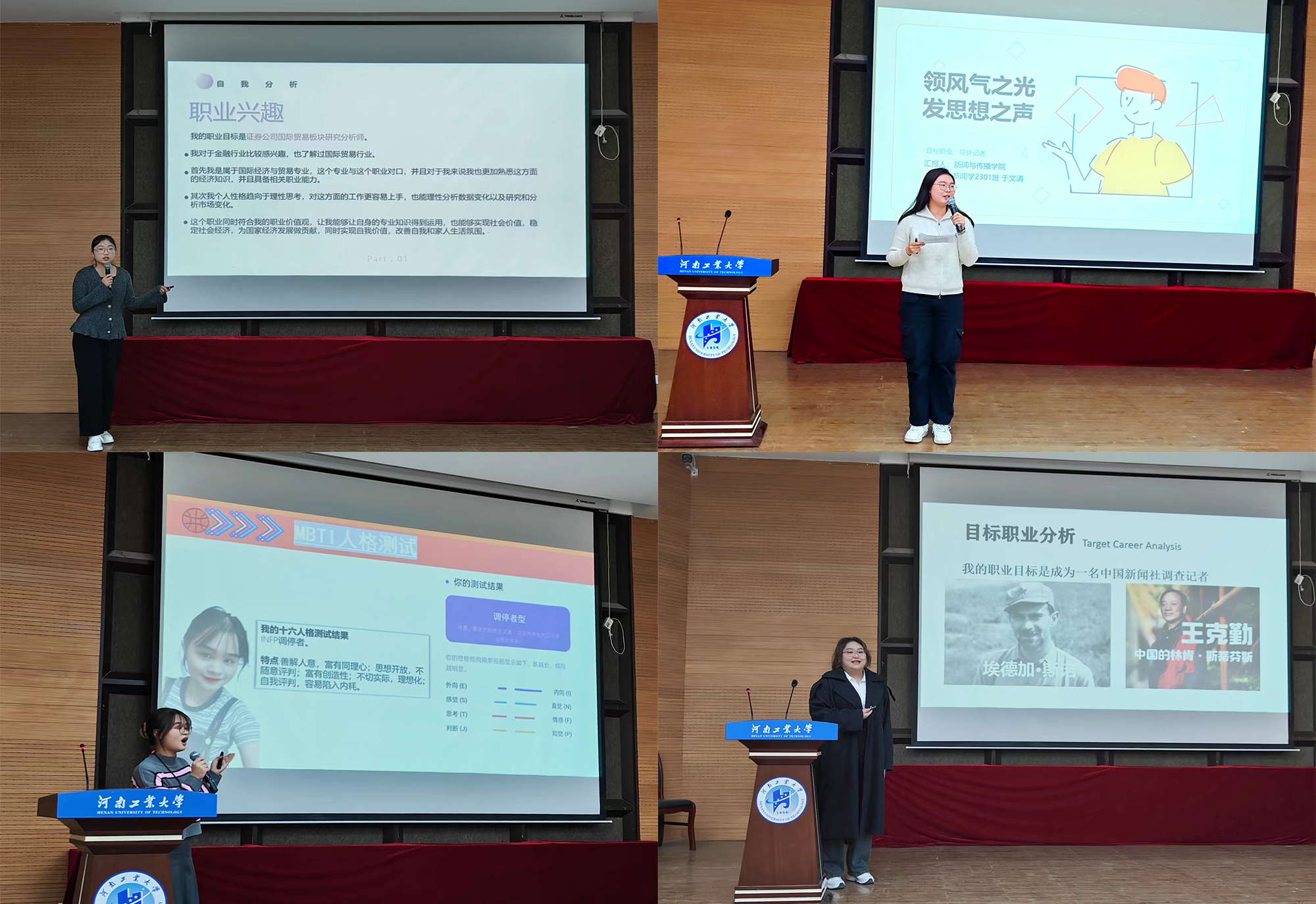 决赛现场,参赛选手们结合自己的生涯发展报告进行了生动地陈述和展示。他们以自身专业特色为切入点,并与当前社会背景相结合,从自我认知、职业环境分析、职业目标确定、评估与调整等方面,介绍了自己的职业发展规划、实现职业目标的具体行动和成果。网络与新媒体专业的周畅然同学立志成为一名政府机关政务媒体运营师,在网络上弘扬社会正能量。金融学专业的李腾希立志进入中央银行监督管理委员会合作金融机构监督部。中国新闻社调查记者、检察院司法行政人员、国际贸易研究分析师……选手们的职业目标和规划方案为同学们未来的就业方向提供了思路,也为更多同学确立自己的未来方向和就业目标提供了有益启发。评委们对参赛选手的主题陈述、生涯发展报告等内容进行点评,指出了选手存在的不足,并给出了提升的建议。