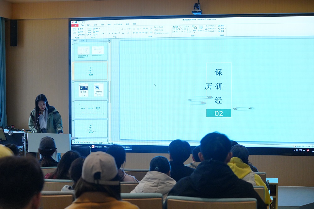 首先郑文凯向同学们分享了自己的考研计划与实践成果,介绍了考研的相关经验,为同学们提供了切实有效的建议,坚定了同学们升学的信心。同时他还向同学们介绍了创新创业类大赛的重要性,分享了自己的参赛经验,鼓励同学们在竞赛中提升自己的综合素质和知识实际运用的能力。陈欢从自己获得国奖的经历开始分享,详细介绍了自己大学期间参加活动、比赛、保研的新路历程。她把自己前往多所大学进行面试的经历分享给大家,鼓励同学们培养良好心态,勇于尝试,并花时间为目标努力奋斗。同时,她也向同学们展示了自己的竞赛作品,让同学们切实地感受到竞赛的相关内容。