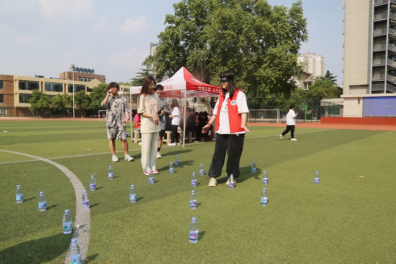 在喜笑颜开园区,同学们从志愿者手中领取空白口罩和水粉颜料,通过发挥自己的想象力对口罩进行改装创造,用水粉画出自己心仪的图案,释放日常生活中的压力;在喜气冲天园区,志愿者为参赛同学分发空白扇子,同学们通过互相交流制作扇子,拉近彼此关系,以做手工的方式排解烦恼,在即将迎来的夏日里拥抱好心情;在同心协力游戏中,同学们分工合作,佩戴眼罩的同学根据另一名同学的指示避开重重障碍前进,在到达终点时领取贴纸,促进同学间的沟通交流;心算迷航游戏中,同学们激发大脑潜能,在游戏区激情运算,大大增加了同学们的感知力、记忆力和注意力;套圈活动中,同学们用有限的圈环去套场地内的矿泉水,锻炼手眼协调能力和目测能力,套中三个及其以上的同学还能兑换自己想要的奖品。