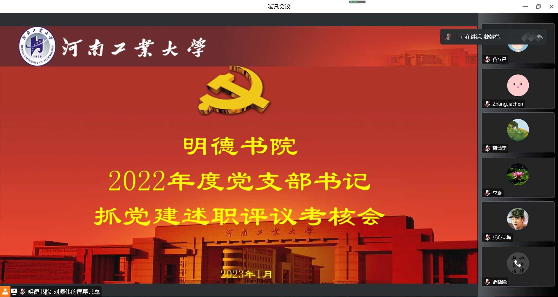 魏朝举分别对各支部书记抓党建述职工作进行了点评,并进行了总结发言。他对各支部的工作给予了充分肯定,尤其是对全体党员在2022年度校园疫情防控工作中的表现给予了高度评价,并就做好下一年度党建工作提出三点要求:一是要深入学习贯彻党的二十大精神,用习近平新时代中国特色社会主义思想武装头脑,进一步激发各党支部活力;二是要认真总结,发扬成绩、改进不足,深入推进“支部品牌”特色项目建设;三是要认真谋划2023年度工作,发挥双院协同育人合力,积极探索人才培养模式改革,为学校“双一流”创建作出更多贡献。(草莓视频 撰稿:刘振伟  审校:刘飞翔 审核:魏朝举)
