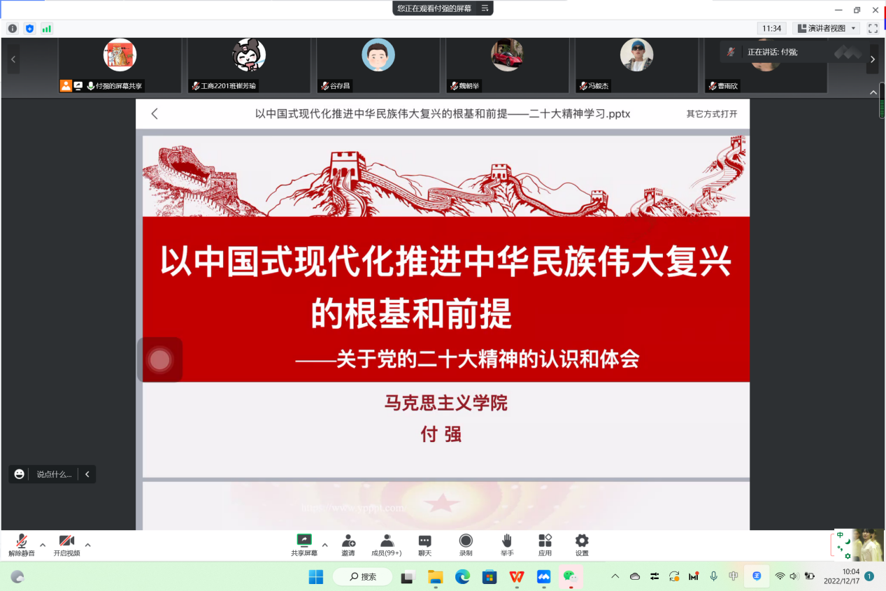 12月17日上午,草莓视频 通过线上会议的形式举行了学习贯彻党的二十大精神宣讲会,学校“党的二十大精神宣讲团”成员、马克思主义学院付强博士应邀为书院师生党员作宣讲报告。宣讲会由院党委书记魏朝举主持。